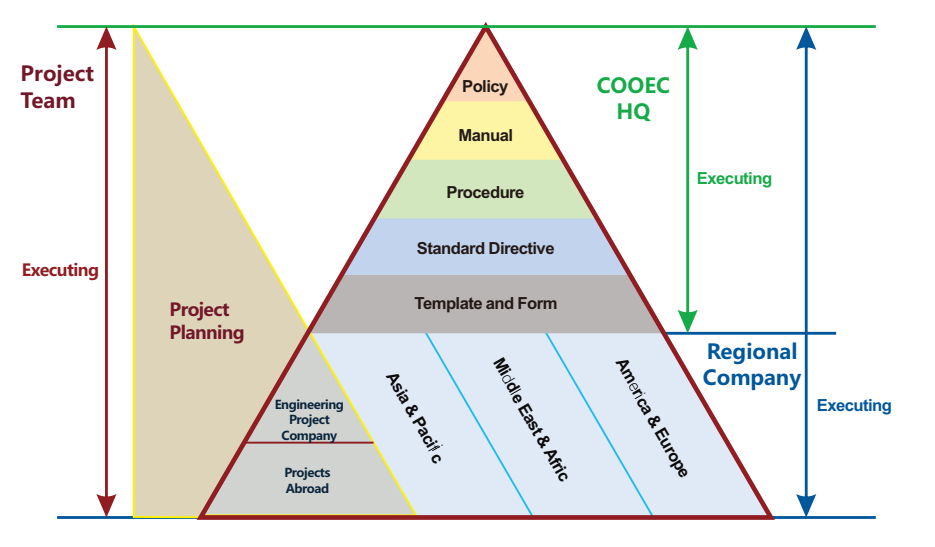 COOEC?QHSE management system encompasses three dimensions: headquarters, regional companies, and projects. We tailor our management system to specific regions and projects based on our headquarters-level management system, which comprises five levels:?policy, management manual, procedure, standard directive, and template & form.