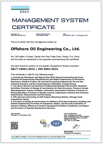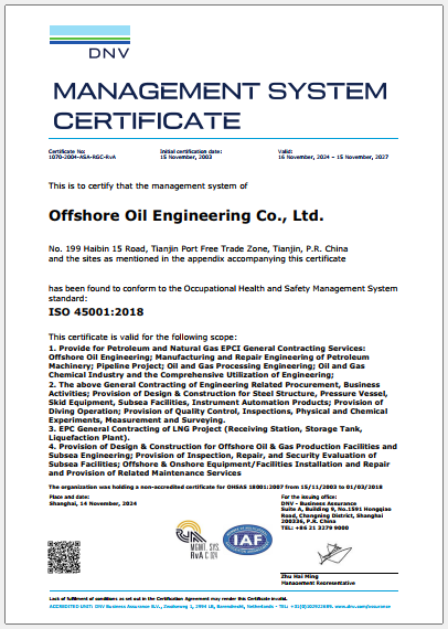 Offshore Oil Engineering Co., Ltd. is a listed company controlled by China National Offshore Oil Corporation. It is the only large general contracting company in China with capacities to undertake the design, procurement, construction, offshore installation, commissioning and maintenance of offshore oil and gas development projects, as well as the liquefied natural gas, offshore wind power, refining and chemical projects, etc. It is also one of the largest and the most competitive EPCI (engineering, procurement, construction and installation) contractors of offshore oil and gas projects in the Asia-Pacific region. The Company is headquartered in Binhai New Area, Tianjin. It was listed on Shanghai Stock Exchange (Stock Short Name: COOEC, Stock Symbol: 600583) on February 2002.